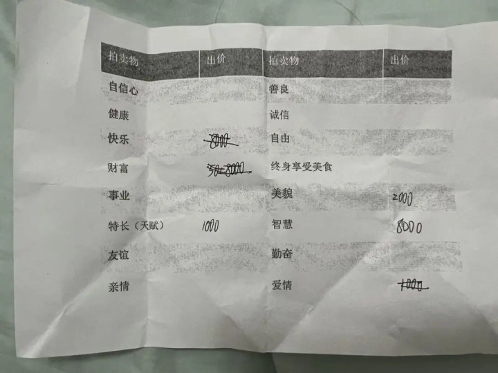 老师在课前说:“我们不做金钱交易,只拍卖人生的可能性。你的出价,是内心的选择;你拍下的,是未来的自己。”同学们踊跃参与,课堂气氛很热烈,但也有女生因为竞拍爱情而受到同学们的议论。